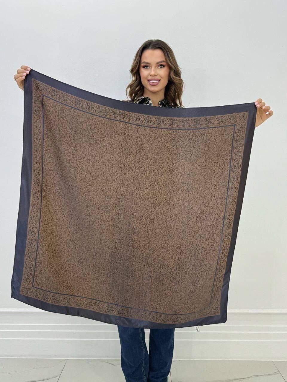Платок с рисунком — стильный аксессуар для вашего неотразимого образа. Размер изделия составляет 100*100, что позволяет использовать его как шарф или головной убор.