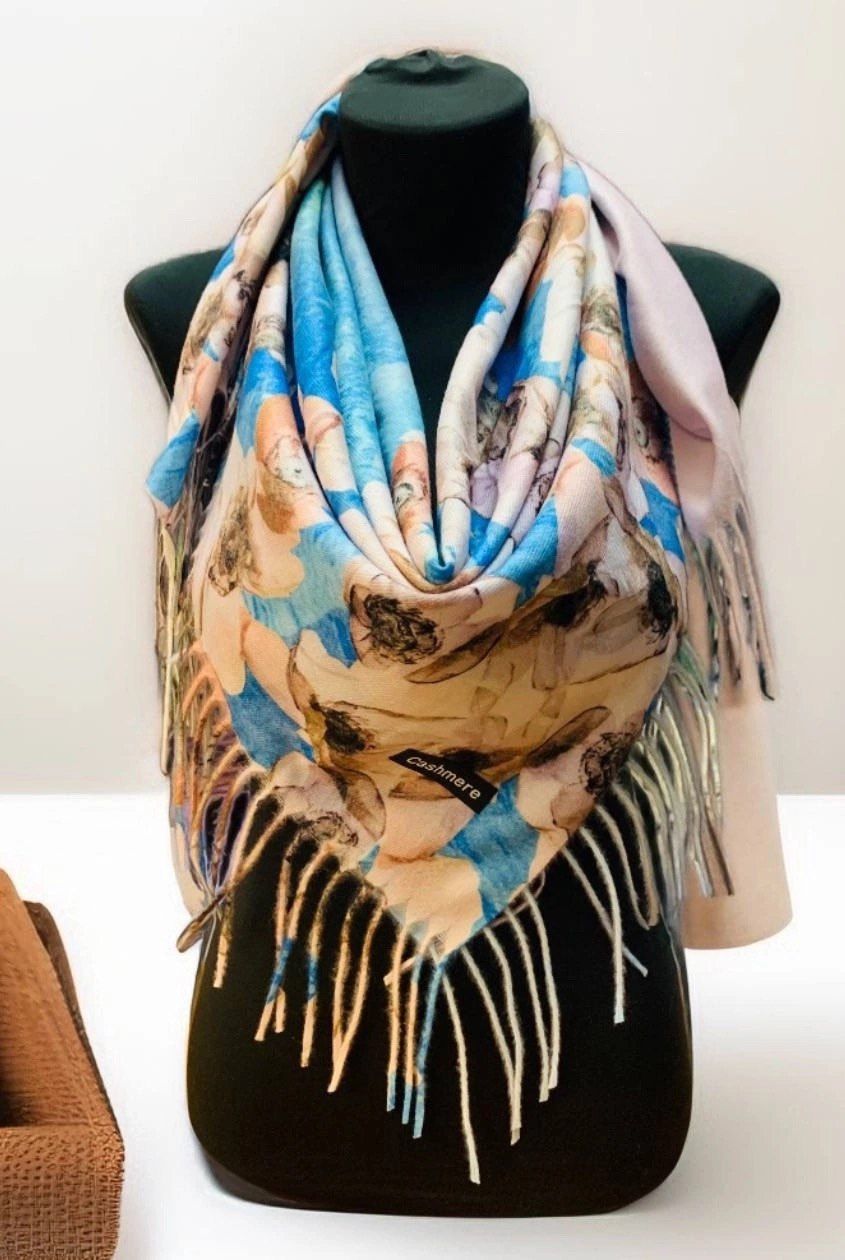 Теплый платок с цветами из кашемира — стильный аксессуар для вашего неотразимого образа. Размер изделия составляет 100*100, что позволяет использовать его как шарф или головной убор.