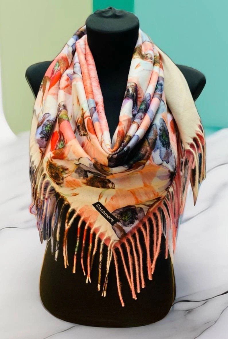 Теплый платок с цветами из кашемира — стильный аксессуар для вашего неотразимого образа. Размер изделия составляет 100*100, что позволяет использовать его как шарф или головной убор.
