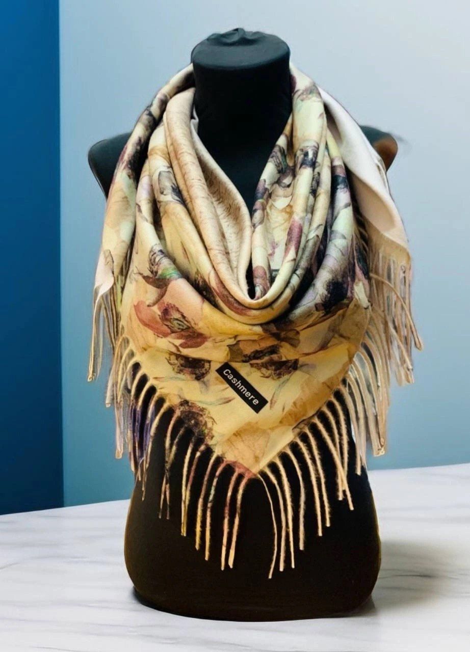 Теплый платок с цветами из кашемира — стильный аксессуар для вашего неотразимого образа. Размер изделия составляет 100*100, что позволяет использовать его как шарф или головной убор.