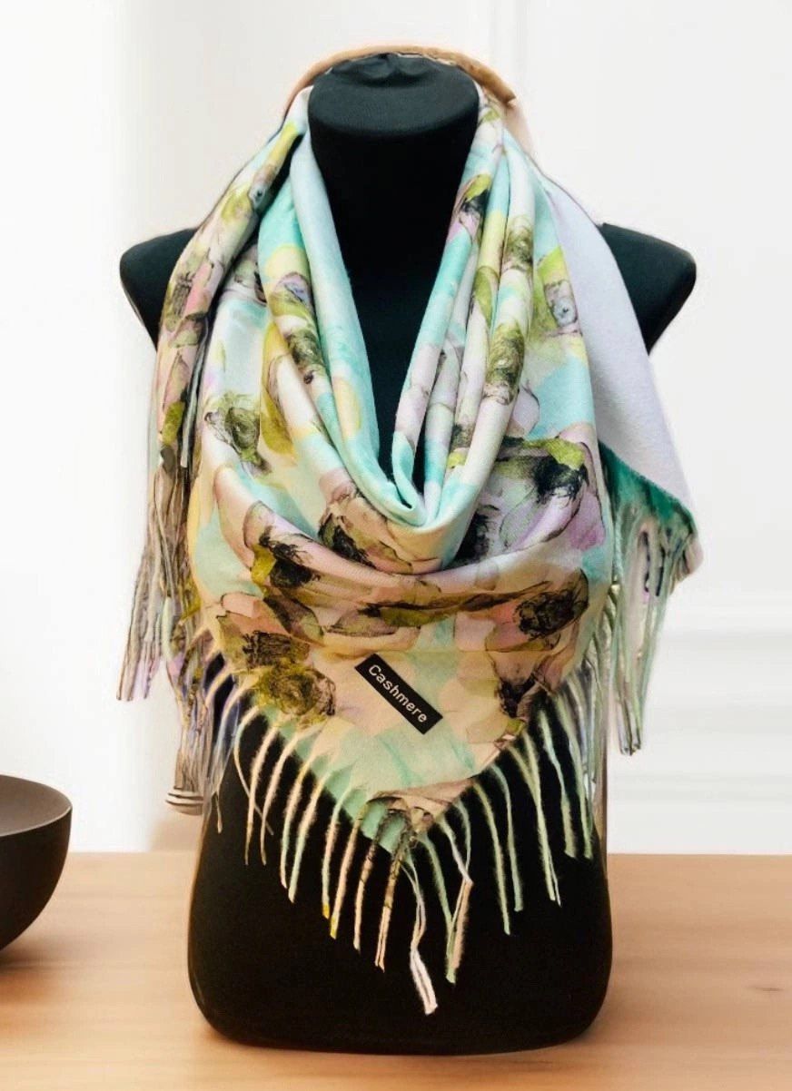 Теплый платок с цветами из кашемира — стильный аксессуар для вашего неотразимого образа. Размер изделия составляет 100*100, что позволяет использовать его как шарф или головной убор.