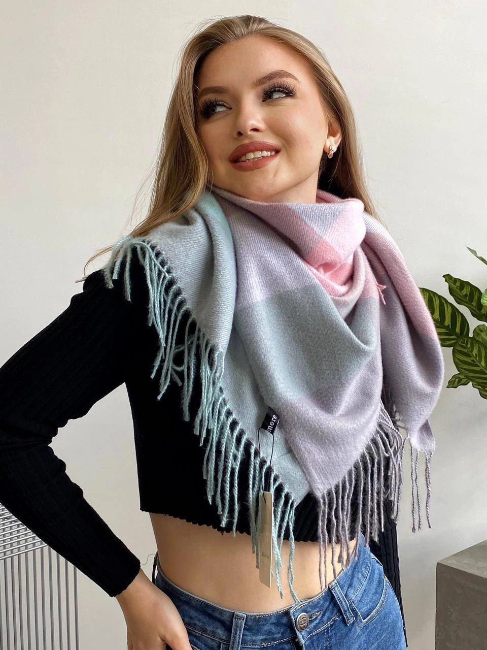 Теплый платок из кашемира — стильный аксессуар для вашего неотразимого образа. Размер изделия составляет 100*100, что позволяет использовать его как шарф или головной убор.
