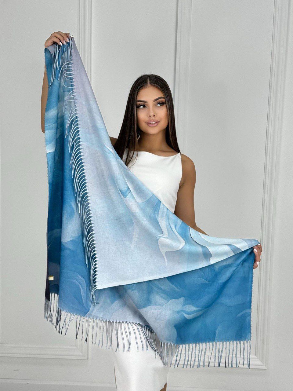 Двусторонний платок из кашемира с рисунком — стильный аксессуар для вашего неотразимого образа. Размер изделия составляет 100*100, что позволяет использовать его как шарф или головной убор.