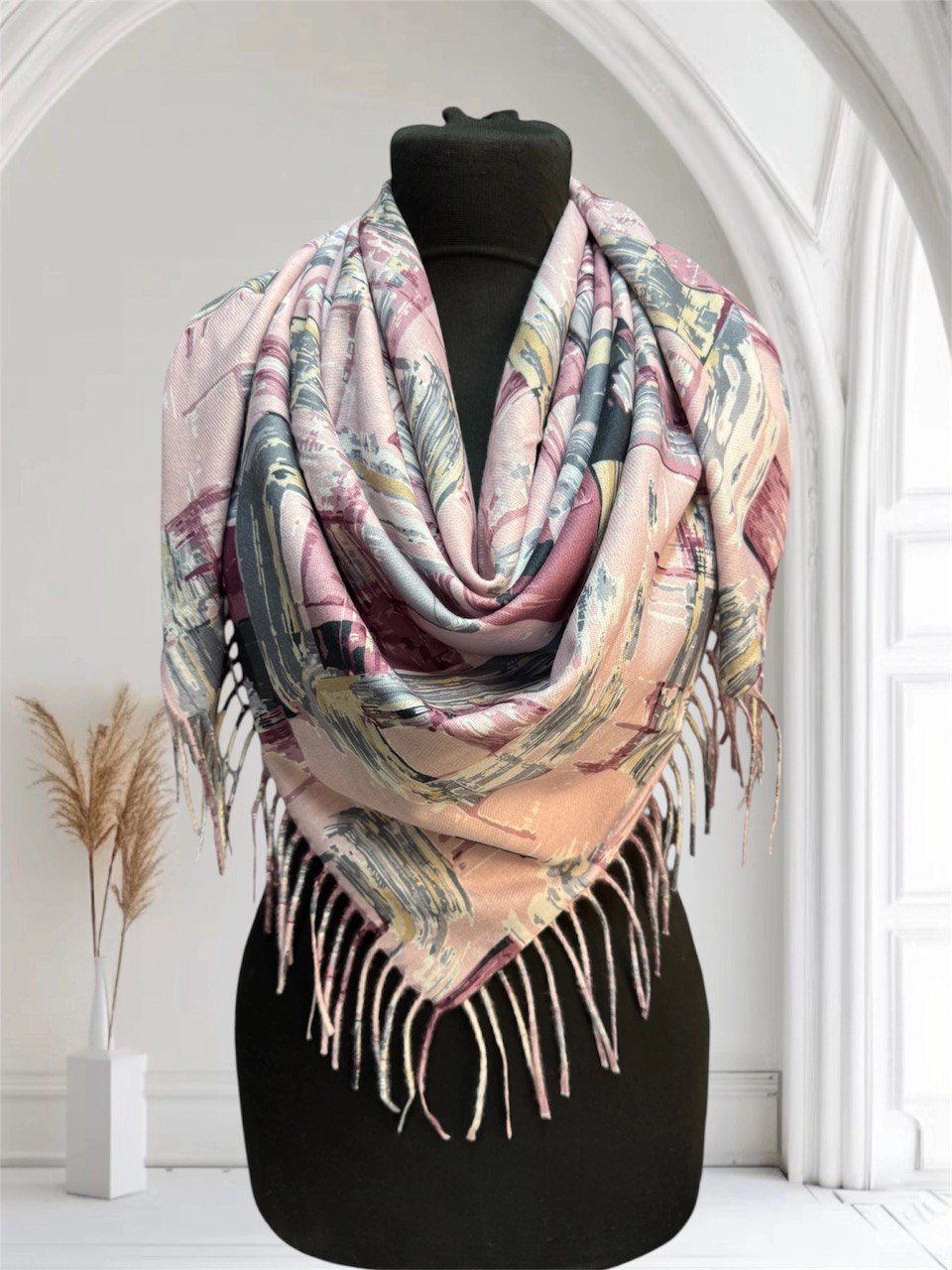 Теплый платок с рисунком из кашемира — стильный аксессуар для вашего неотразимого образа. Размер изделия составляет 100*100, что позволяет использовать его как шарф или головной убор.