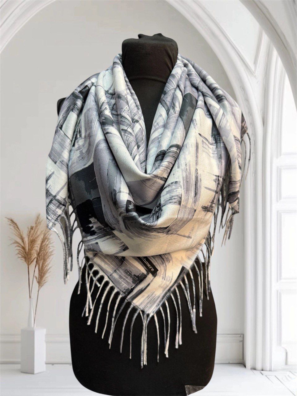 Теплый платок с рисунком из кашемира — стильный аксессуар для вашего неотразимого образа. Размер изделия составляет 100*100, что позволяет использовать его как шарф или головной убор.