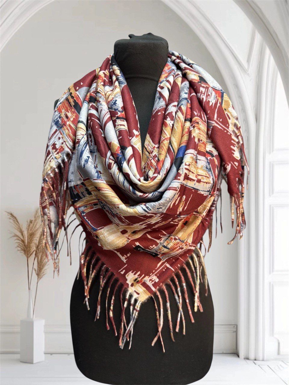 Теплый платок с рисунком из кашемира — стильный аксессуар для вашего неотразимого образа. Размер изделия составляет 100*100, что позволяет использовать его как шарф или головной убор.