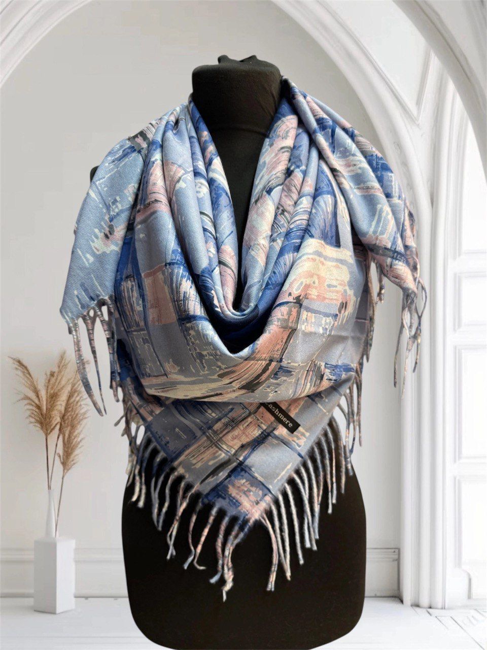 Теплый платок с рисунком из кашемира — стильный аксессуар для вашего неотразимого образа. Размер изделия составляет 100*100, что позволяет использовать его как шарф или головной убор.