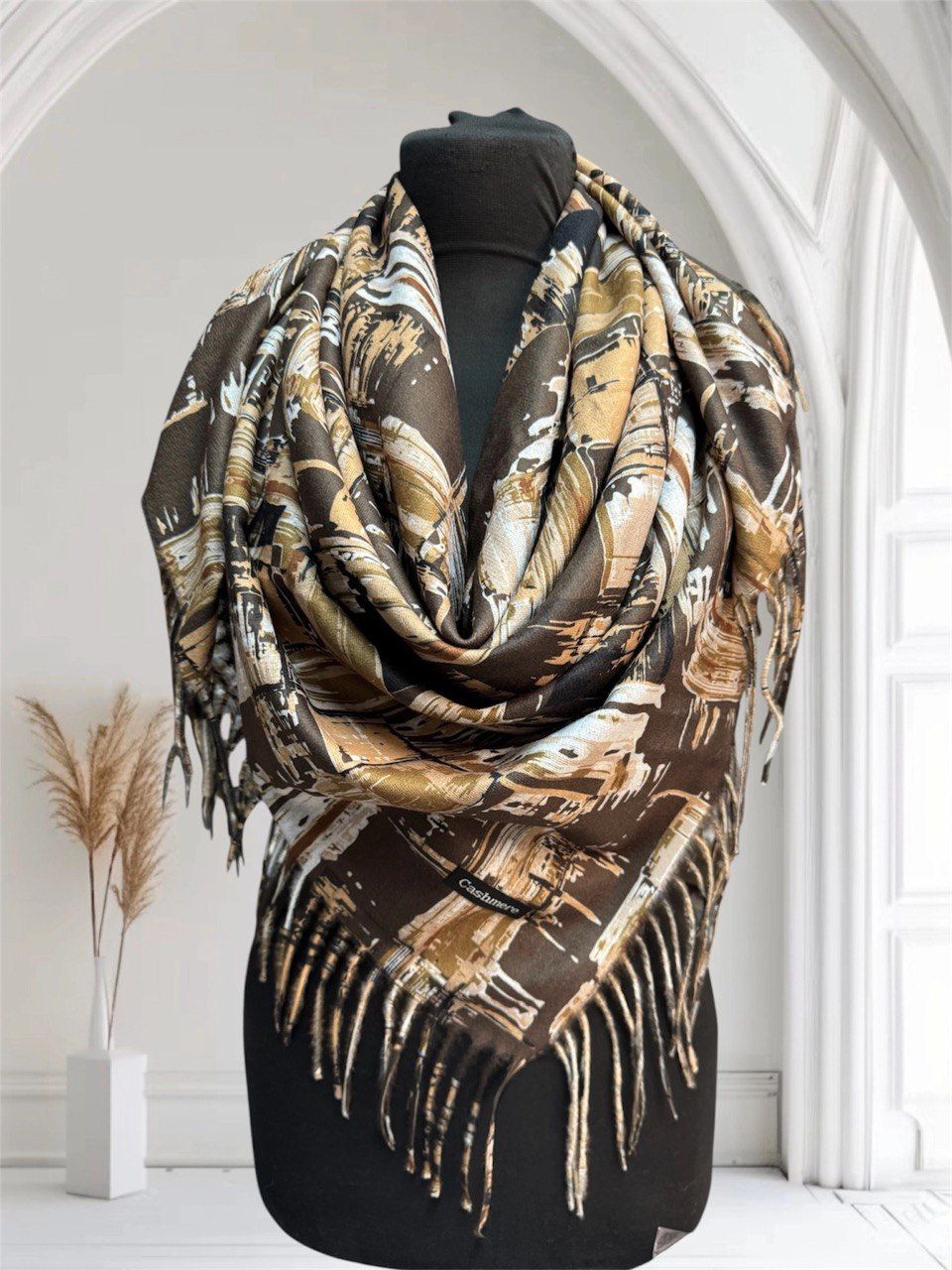 Теплый платок с рисунком из кашемира — стильный аксессуар для вашего неотразимого образа. Размер изделия составляет 100*100, что позволяет использовать его как шарф или головной убор.