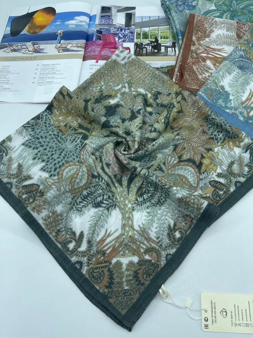 Шерстяной платок с рисунком — стильный аксессуар для вашего неотразимого образа. Размер изделия составляет 100*100, что позволяет использовать его как шарф или головной убор.