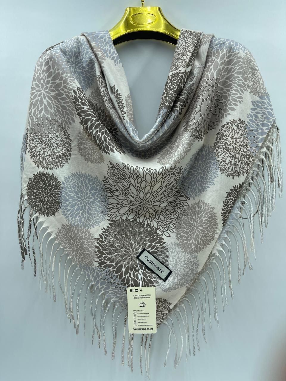 Теплый платок из кашемира с оригинальным рисунком — стильный аксессуар для вашего неотразимого образа. Размер изделия составляет 100*100, что позволяет использовать его как шарф или головной убор.