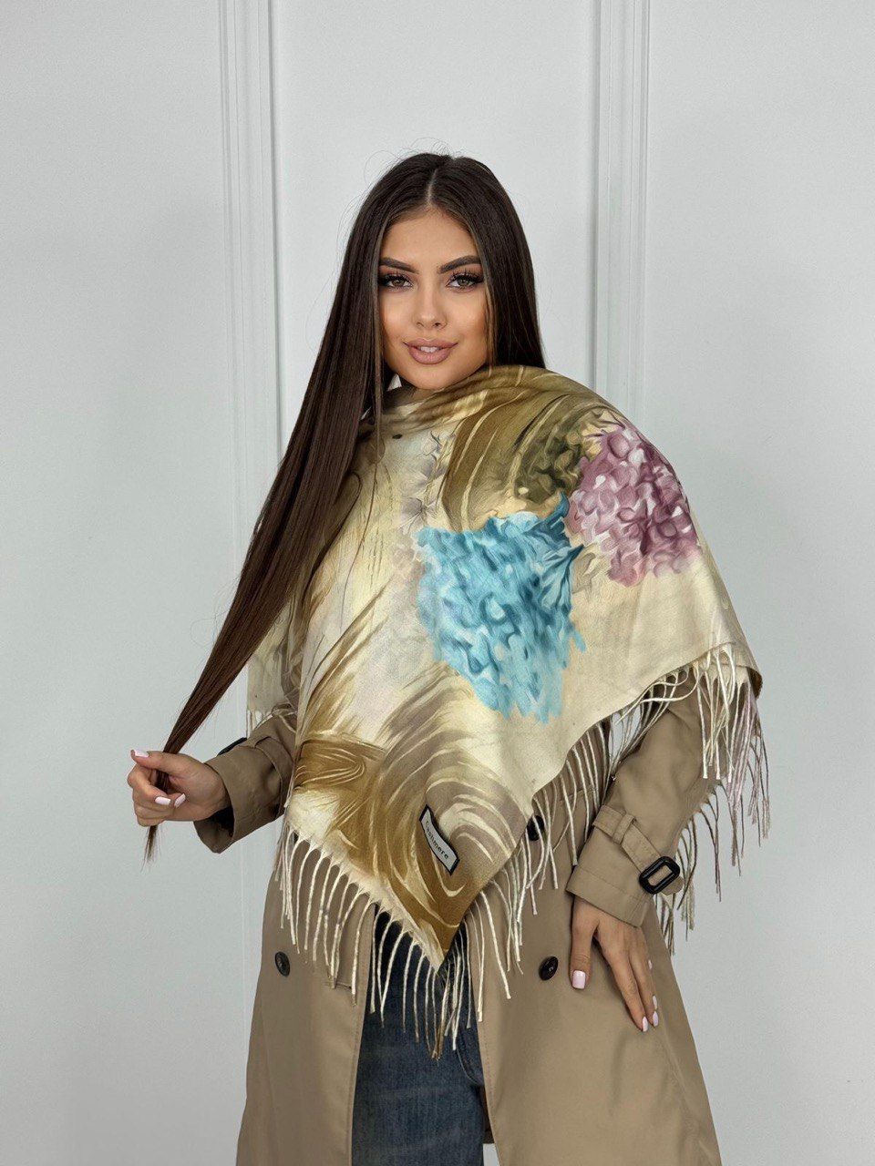 Теплый платок из кашемира с оригинальным рисунком — стильный аксессуар для вашего неотразимого образа. Размер изделия составляет 110*110, что позволяет использовать его как шарф или головной убор.