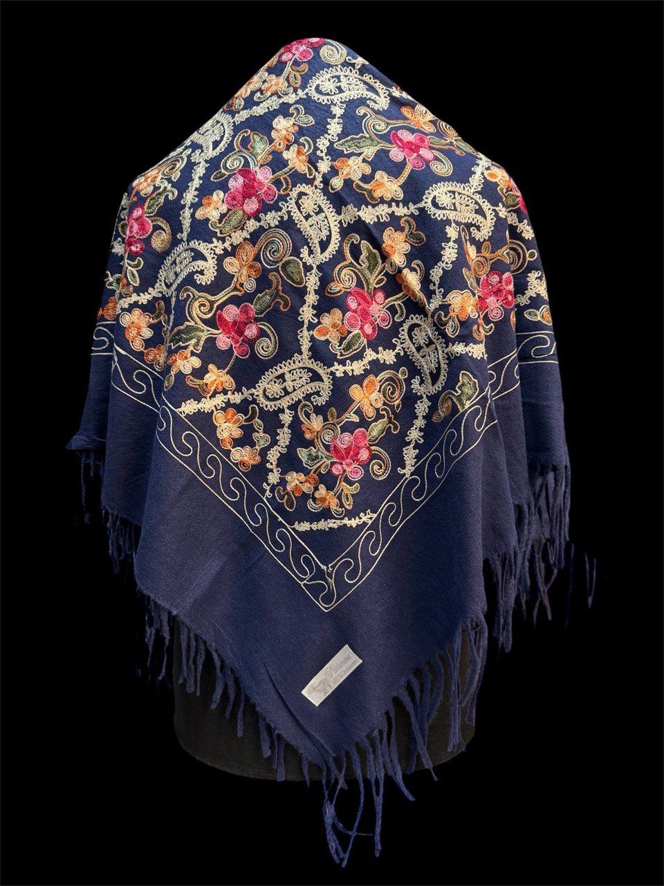 Теплый платок из кашемира с рисунком — стильный аксессуар для вашего неотразимого образа. Размер изделия составляет 120*120, что позволяет использовать его как шарф или головной убор.