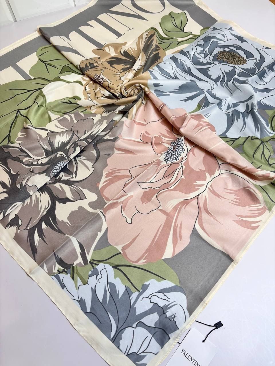 Платок с цветами — стильный аксессуар для вашего неотразимого образа. Размер изделия составляет 90*90, что позволяет использовать его как шарф или головной убор.