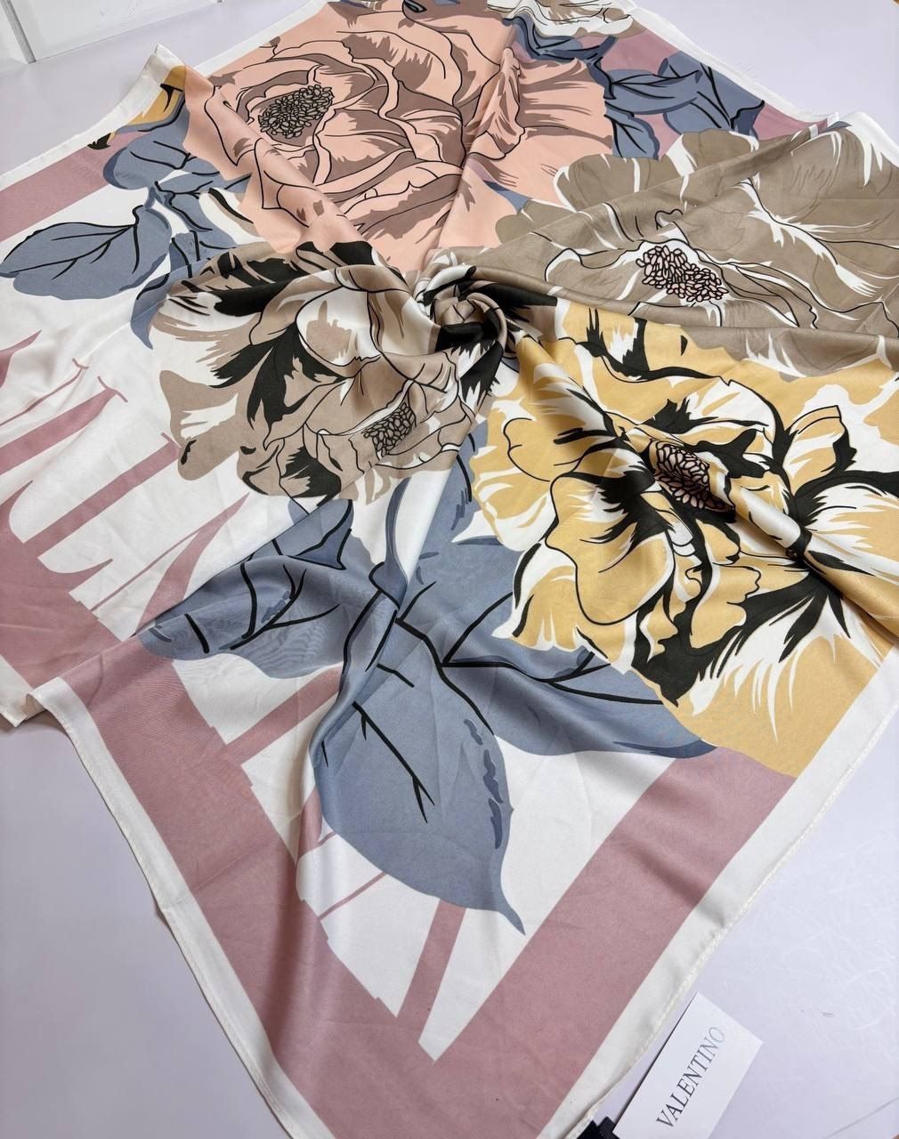 Платок с цветами — стильный аксессуар для вашего неотразимого образа. Размер изделия составляет 90*90, что позволяет использовать его как шарф или головной убор.