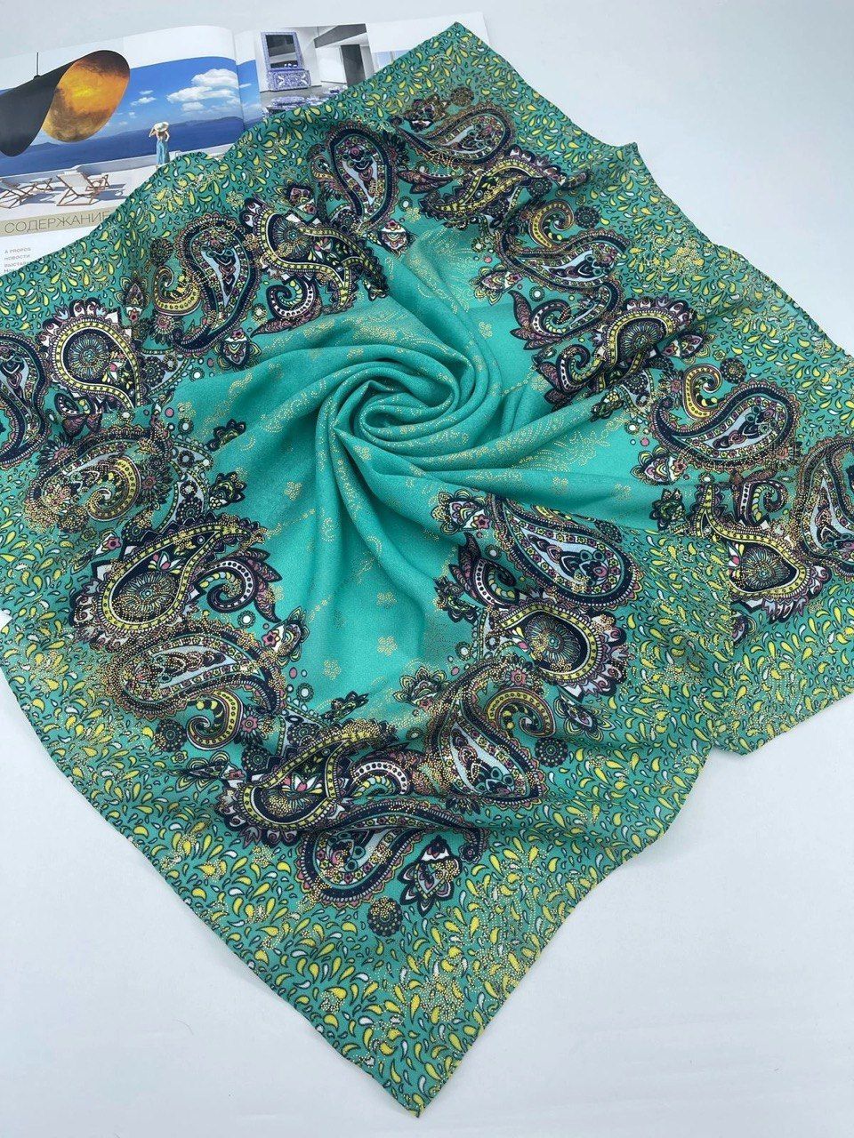 Красивый платок с рисунком — стильный аксессуар для вашего неотразимого образа. Размер изделия составляет 90*90, что позволяет использовать его как шарф или головной убор.