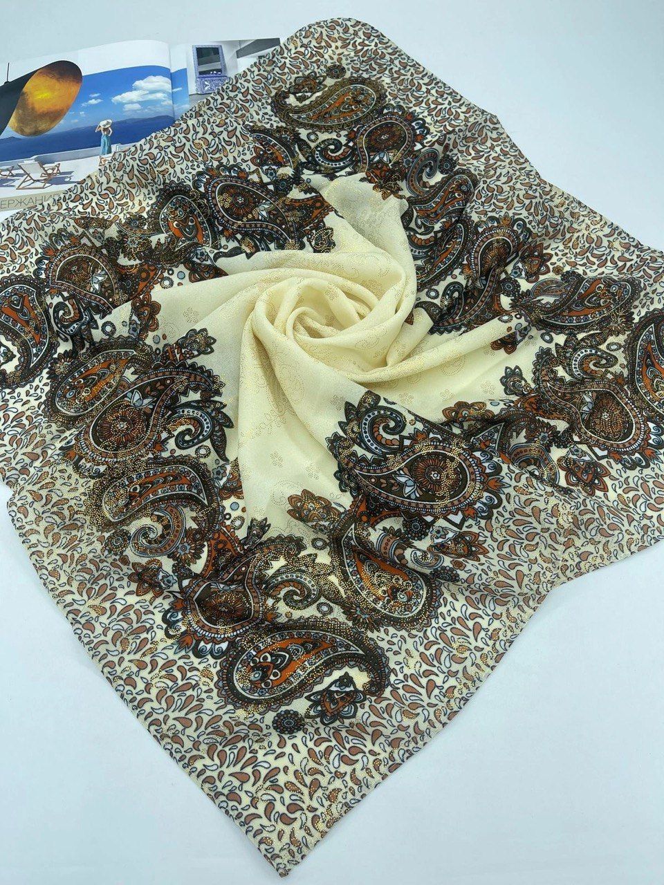 Красивый платок с рисунком — стильный аксессуар для вашего неотразимого образа. Размер изделия составляет 90*90, что позволяет использовать его как шарф или головной убор.