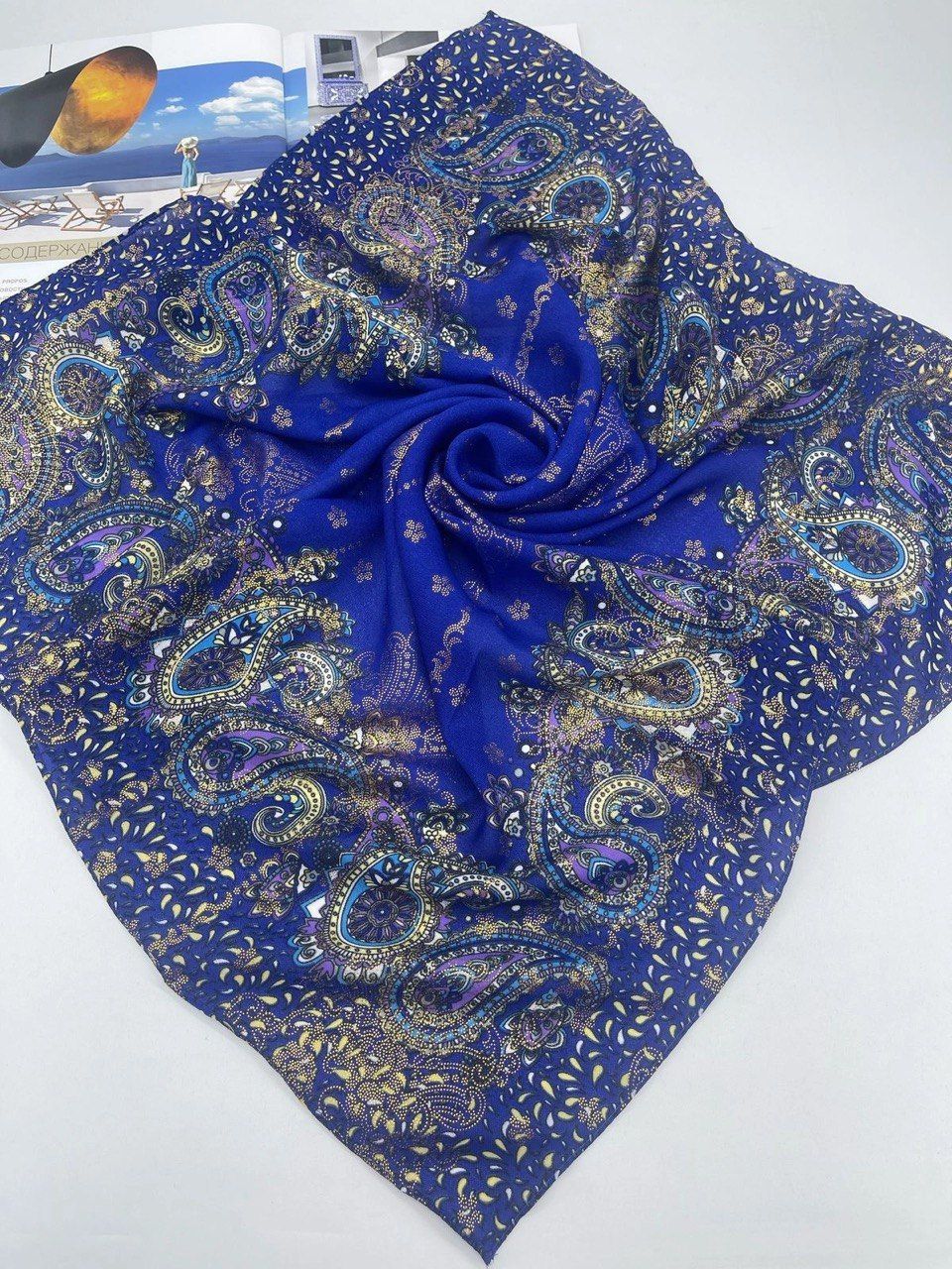 Красивый платок с рисунком — стильный аксессуар для вашего неотразимого образа. Размер изделия составляет 90*90, что позволяет использовать его как шарф или головной убор.