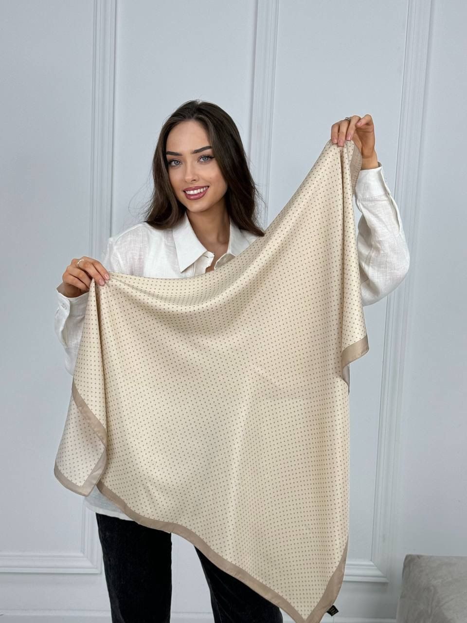 Очаровательный платок в горошек — стильный аксессуар для вашего неотразимого образа. Размер изделия составляет 90*90, что позволяет использовать его как шарф или головной убор.