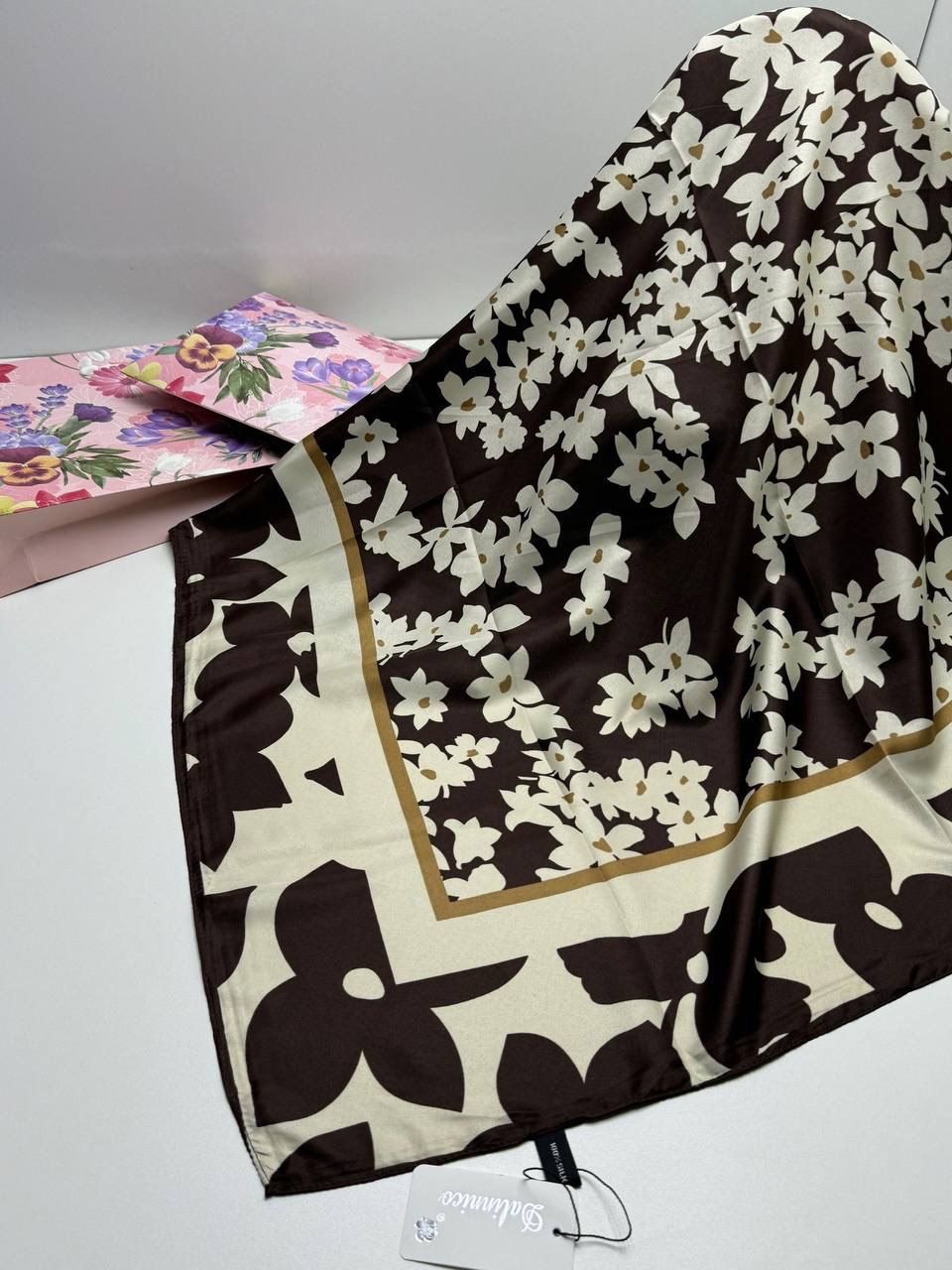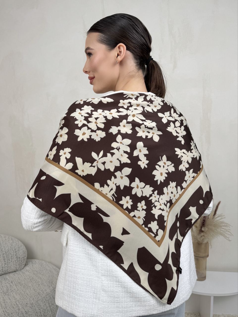 Очаровательный платок с цветами — стильный аксессуар для вашего неотразимого образа. Размер изделия составляет 90*90, что позволяет использовать его как шарф или головной убор.