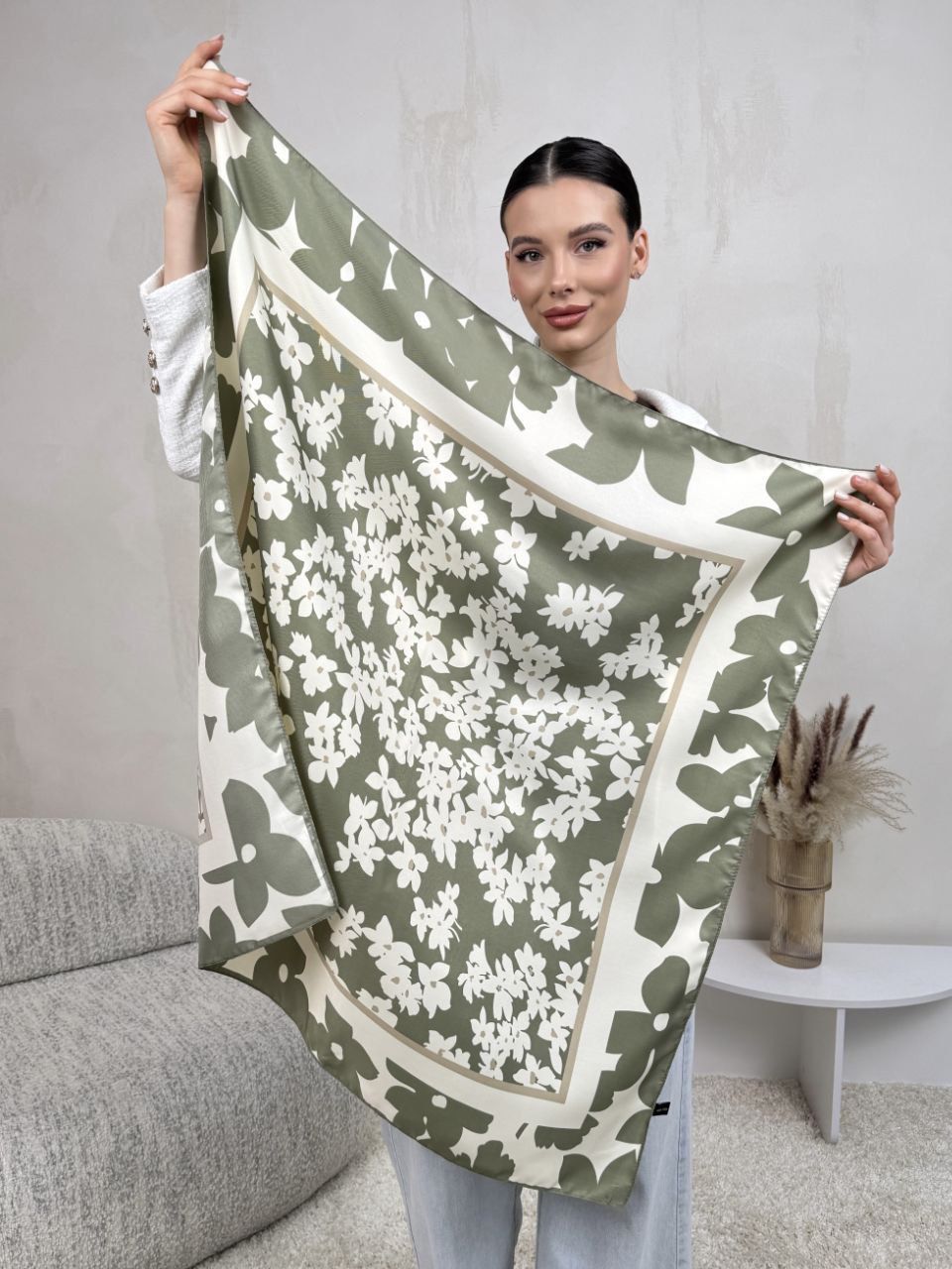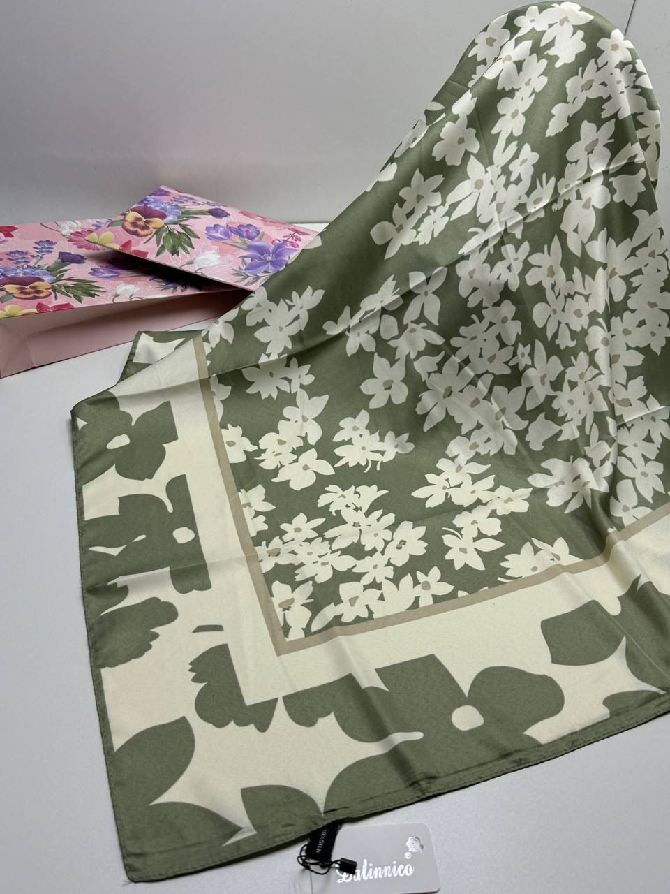 Очаровательный платок с цветами — стильный аксессуар для вашего неотразимого образа. Размер изделия составляет 90*90, что позволяет использовать его как шарф или головной убор.