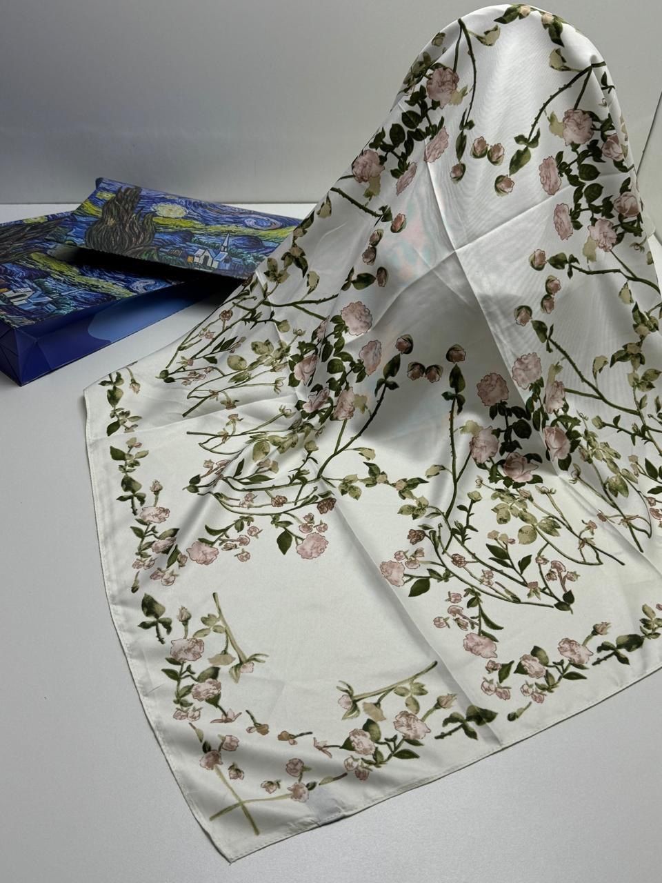 Платок с рисунком — стильный аксессуар для вашего неотразимого образа. Размер изделия составляет 90*90, что позволяет использовать его как шарф или головной убор.