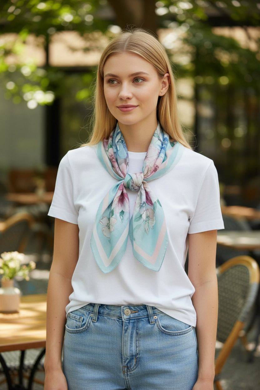 Хлопковый очаровательный платок — стильный аксессуар для вашего неотразимого образа. Размер изделия составляет 90*90, что позволяет использовать его как шарф или головной убор.