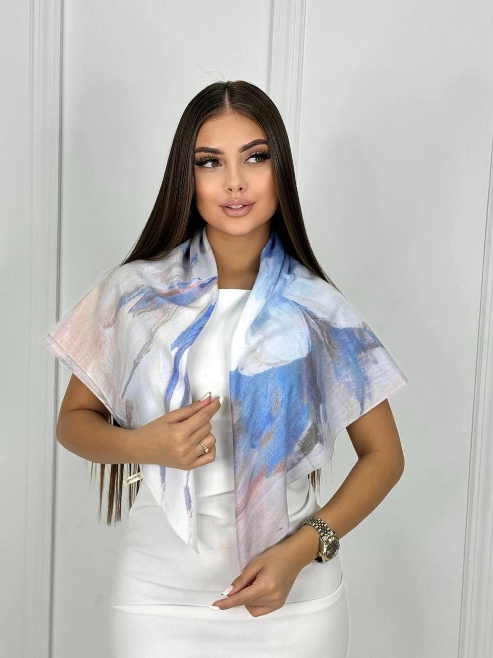 Шерстяной платок с оригинальным рисунком — стильный аксессуар для вашего неотразимого образа. Размер изделия составляет 90*90, что позволяет использовать его как шарф или головной убор.