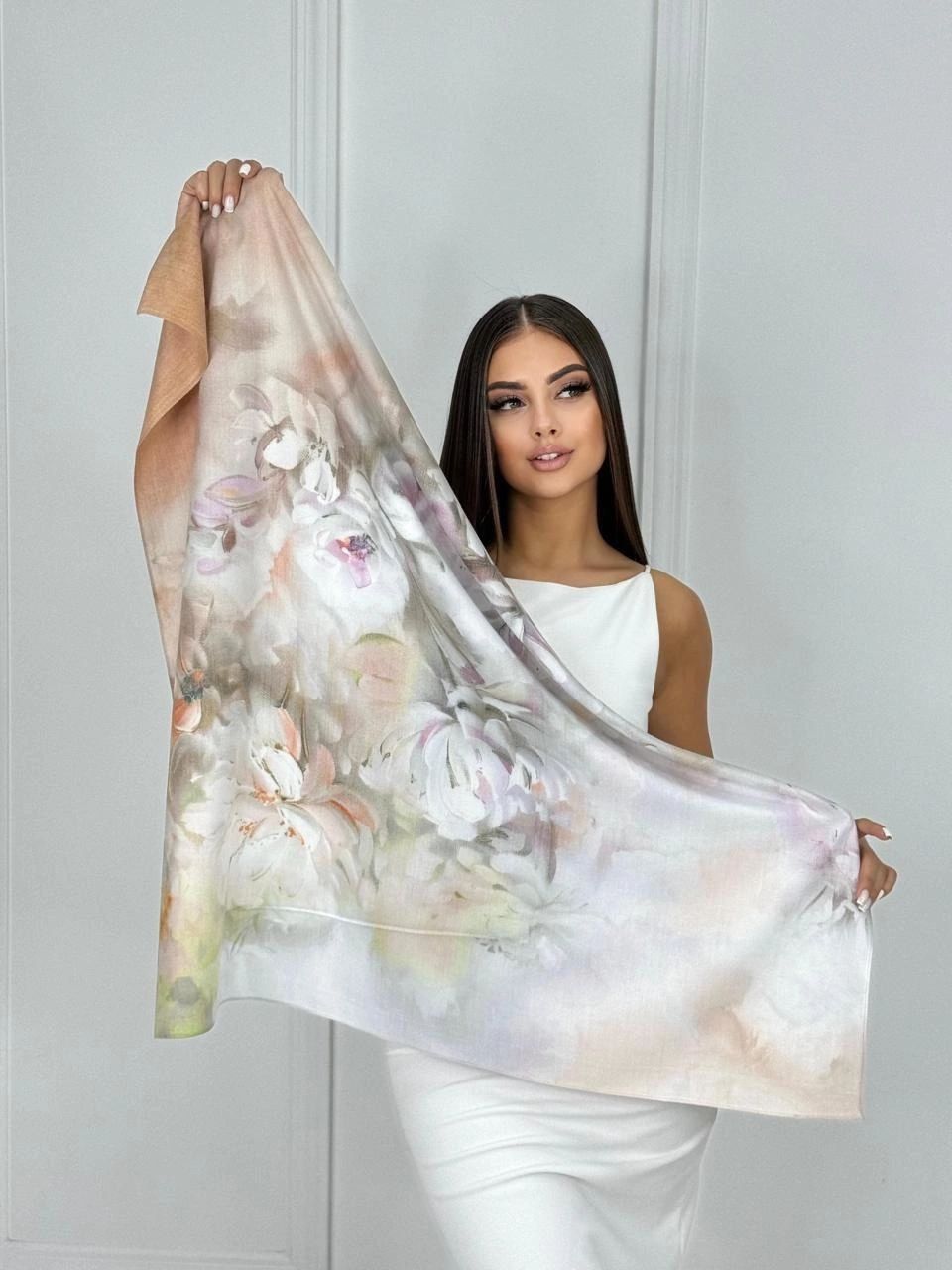 Шерстяной платок с оригинальным рисунком — стильный аксессуар для вашего неотразимого образа. Размер изделия составляет 90*90, что позволяет использовать его как шарф или головной убор.