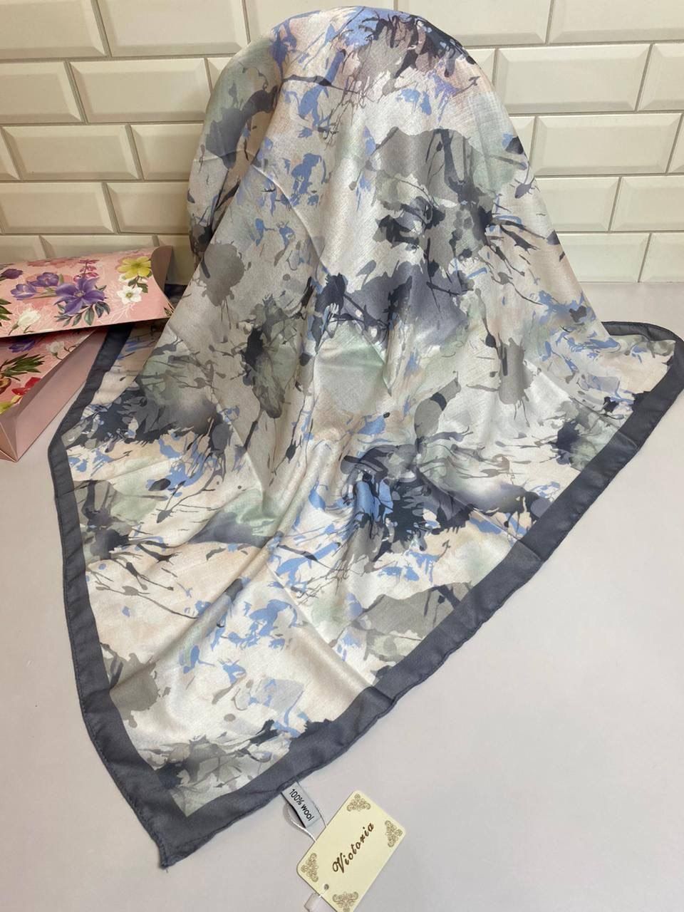 Платок из тонкой шерсти с рисунком — стильный аксессуар для вашего неотразимого образа. Размер изделия составляет 90*90, что позволяет использовать его как шарф или головной убор.