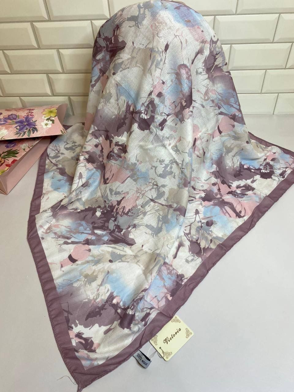 Платок из тонкой шерсти с рисунком — стильный аксессуар для вашего неотразимого образа. Размер изделия составляет 90*90, что позволяет использовать его как шарф или головной убор.