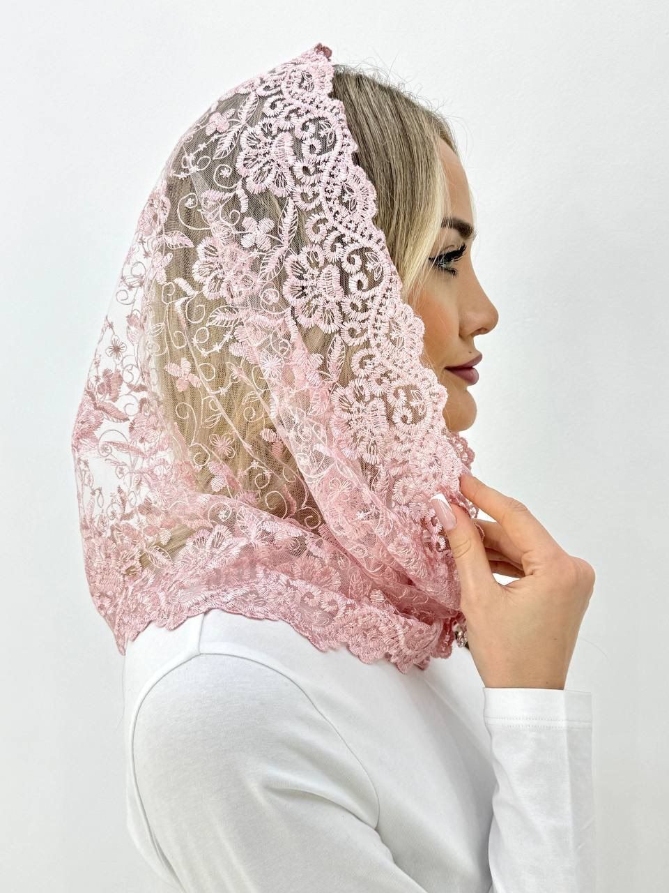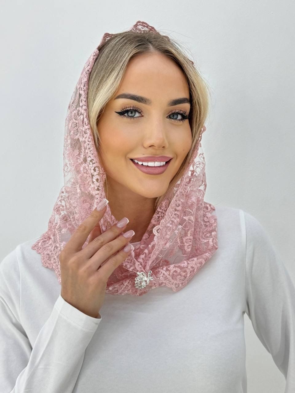 Платок-капор из вискозы с красивой брошью — стильный аксессуар для вашего похода в храм. Размер изделия составляет 85*40, что позволяет использовать его как головной убор и как шарф.